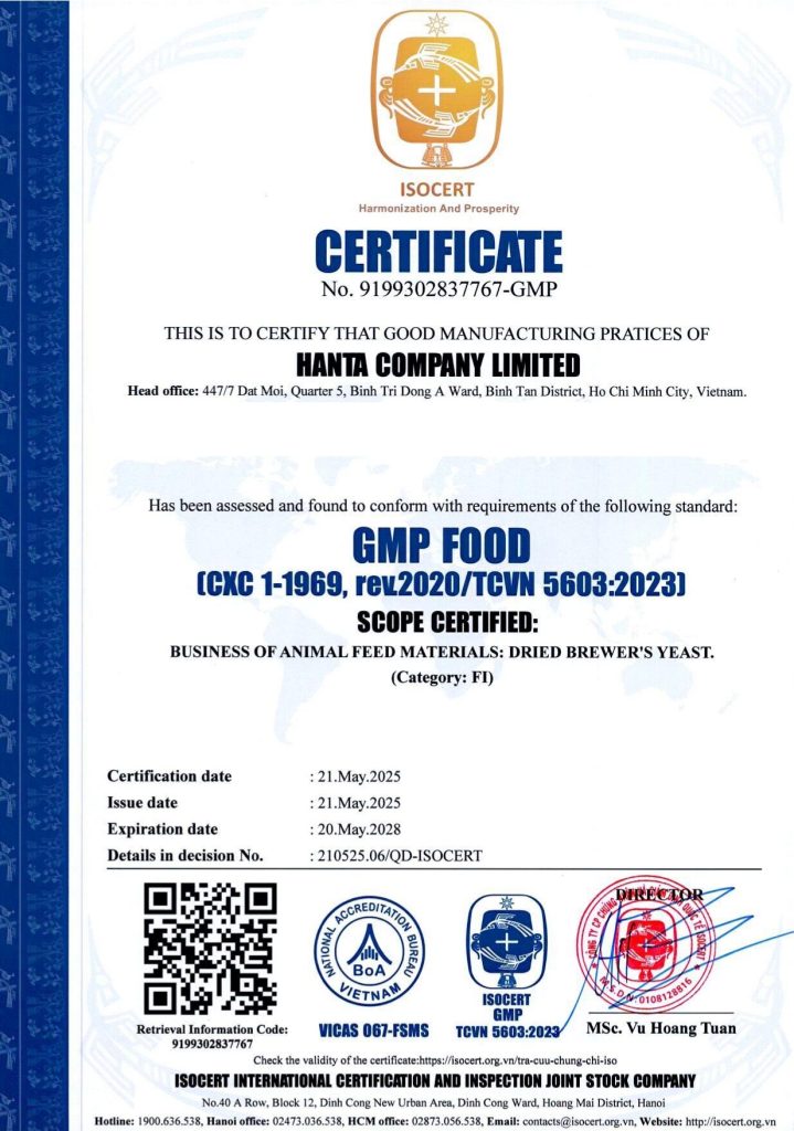 Here is our Good Manufacturing Practice (GMP) Certificate for producing Brewer Dried Yeast (Beer Yeast Powder)